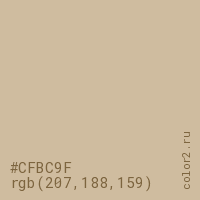 Цвет #CFBC9F в цветовой модели RGB обозначается тремя октетами (207, 188, 159) в десятичном формате и #CFBC9F в шестнадцатиричном (hex) формате, которые являются интенсивностью красного 207 (hex CF), интенсивность зелёного 188 (hex BC) и интенсивность синего 159 (hex 9F).
