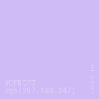 Цвет #CFBCF7 в цветовой модели RGB обозначается тремя октетами (207, 188, 247) в десятичном формате и #CFBCF7 в шестнадцатиричном (hex) формате, которые являются интенсивностью красного 207 (hex CF), интенсивность зелёного 188 (hex BC) и интенсивность синего 247 (hex F7).