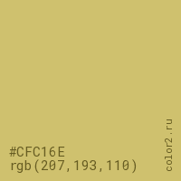 Цвет #CFC16E в цветовой модели RGB обозначается тремя октетами (207, 193, 110) в десятичном формате и #CFC16E в шестнадцатиричном (hex) формате, которые являются интенсивностью красного 207 (hex CF), интенсивность зелёного 193 (hex C1) и интенсивность синего 110 (hex 6E).