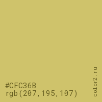 Цвет #CFC36B в цветовой модели RGB обозначается тремя октетами (207, 195, 107) в десятичном формате и #CFC36B в шестнадцатиричном (hex) формате, которые являются интенсивностью красного 207 (hex CF), интенсивность зелёного 195 (hex C3) и интенсивность синего 107 (hex 6B).