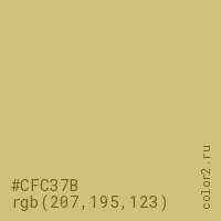 Цвет #CFC37B в цветовой модели RGB обозначается тремя октетами (207, 195, 123) в десятичном формате и #CFC37B в шестнадцатиричном (hex) формате, которые являются интенсивностью красного 207 (hex CF), интенсивность зелёного 195 (hex C3) и интенсивность синего 123 (hex 7B).