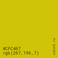 Цвет #CFC407 в цветовой модели RGB обозначается тремя октетами (207, 196, 7) в десятичном формате и #CFC407 в шестнадцатиричном (hex) формате, которые являются интенсивностью красного 207 (hex CF), интенсивность зелёного 196 (hex C4) и интенсивность синего 7 (hex 07).