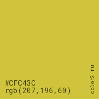 Цвет #CFC43C в цветовой модели RGB обозначается тремя октетами (207, 196, 60) в десятичном формате и #CFC43C в шестнадцатиричном (hex) формате, которые являются интенсивностью красного 207 (hex CF), интенсивность зелёного 196 (hex C4) и интенсивность синего 60 (hex 3C).