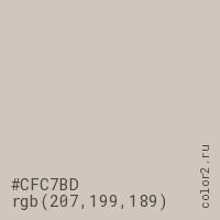 Цвет #CFC7BD в цветовой модели RGB обозначается тремя октетами (207, 199, 189) в десятичном формате и #CFC7BD в шестнадцатиричном (hex) формате, которые являются интенсивностью красного 207 (hex CF), интенсивность зелёного 199 (hex C7) и интенсивность синего 189 (hex BD).
