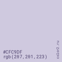 Цвет #CFC9DF в цветовой модели RGB обозначается тремя октетами (207, 201, 223) в десятичном формате и #CFC9DF в шестнадцатиричном (hex) формате, которые являются интенсивностью красного 207 (hex CF), интенсивность зелёного 201 (hex C9) и интенсивность синего 223 (hex DF).