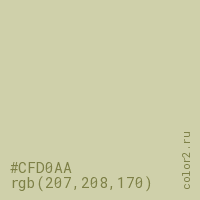 Цвет #CFD0AA в цветовой модели RGB обозначается тремя октетами (207, 208, 170) в десятичном формате и #CFD0AA в шестнадцатиричном (hex) формате, которые являются интенсивностью красного 207 (hex CF), интенсивность зелёного 208 (hex D0) и интенсивность синего 170 (hex AA).