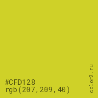 Цвет #CFD128 в цветовой модели RGB обозначается тремя октетами (207, 209, 40) в десятичном формате и #CFD128 в шестнадцатиричном (hex) формате, которые являются интенсивностью красного 207 (hex CF), интенсивность зелёного 209 (hex D1) и интенсивность синего 40 (hex 28).