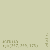 Цвет #CFD1AD в цветовой модели RGB обозначается тремя октетами (207, 209, 173) в десятичном формате и #CFD1AD в шестнадцатиричном (hex) формате, которые являются интенсивностью красного 207 (hex CF), интенсивность зелёного 209 (hex D1) и интенсивность синего 173 (hex AD).