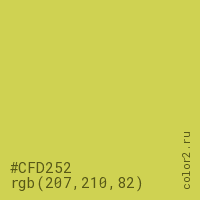 Цвет #CFD252 в цветовой модели RGB обозначается тремя октетами (207, 210, 82) в десятичном формате и #CFD252 в шестнадцатиричном (hex) формате, которые являются интенсивностью красного 207 (hex CF), интенсивность зелёного 210 (hex D2) и интенсивность синего 82 (hex 52).