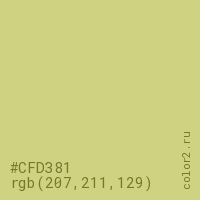Цвет #CFD381 в цветовой модели RGB обозначается тремя октетами (207, 211, 129) в десятичном формате и #CFD381 в шестнадцатиричном (hex) формате, которые являются интенсивностью красного 207 (hex CF), интенсивность зелёного 211 (hex D3) и интенсивность синего 129 (hex 81).