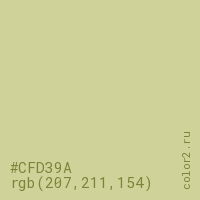 Цвет #CFD39A в цветовой модели RGB обозначается тремя октетами (207, 211, 154) в десятичном формате и #CFD39A в шестнадцатиричном (hex) формате, которые являются интенсивностью красного 207 (hex CF), интенсивность зелёного 211 (hex D3) и интенсивность синего 154 (hex 9A).