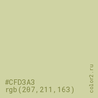 Цвет #CFD3A3 в цветовой модели RGB обозначается тремя октетами (207, 211, 163) в десятичном формате и #CFD3A3 в шестнадцатиричном (hex) формате, которые являются интенсивностью красного 207 (hex CF), интенсивность зелёного 211 (hex D3) и интенсивность синего 163 (hex A3).