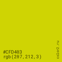 Цвет #CFD403 в цветовой модели RGB обозначается тремя октетами (207, 212, 3) в десятичном формате и #CFD403 в шестнадцатиричном (hex) формате, которые являются интенсивностью красного 207 (hex CF), интенсивность зелёного 212 (hex D4) и интенсивность синего 3 (hex 03).