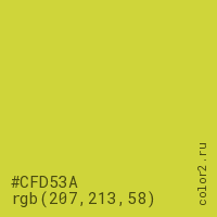 Цвет #CFD53A в цветовой модели RGB обозначается тремя октетами (207, 213, 58) в десятичном формате и #CFD53A в шестнадцатиричном (hex) формате, которые являются интенсивностью красного 207 (hex CF), интенсивность зелёного 213 (hex D5) и интенсивность синего 58 (hex 3A).