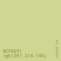 Цвет #CFD691 в цветовой модели RGB обозначается тремя октетами (207, 214, 145) в десятичном формате и #CFD691 в шестнадцатиричном (hex) формате, которые являются интенсивностью красного 207 (hex CF), интенсивность зелёного 214 (hex D6) и интенсивность синего 145 (hex 91).