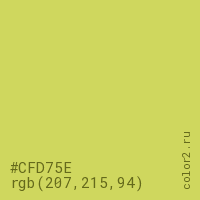 Цвет #CFD75E в цветовой модели RGB обозначается тремя октетами (207, 215, 94) в десятичном формате и #CFD75E в шестнадцатиричном (hex) формате, которые являются интенсивностью красного 207 (hex CF), интенсивность зелёного 215 (hex D7) и интенсивность синего 94 (hex 5E).