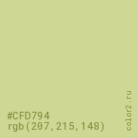 Цвет #CFD794 в цветовой модели RGB обозначается тремя октетами (207, 215, 148) в десятичном формате и #CFD794 в шестнадцатиричном (hex) формате, которые являются интенсивностью красного 207 (hex CF), интенсивность зелёного 215 (hex D7) и интенсивность синего 148 (hex 94).