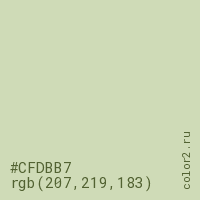 Цвет #CFDBB7 в цветовой модели RGB обозначается тремя октетами (207, 219, 183) в десятичном формате и #CFDBB7 в шестнадцатиричном (hex) формате, которые являются интенсивностью красного 207 (hex CF), интенсивность зелёного 219 (hex DB) и интенсивность синего 183 (hex B7).