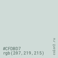 Цвет #CFDBD7 в цветовой модели RGB обозначается тремя октетами (207, 219, 215) в десятичном формате и #CFDBD7 в шестнадцатиричном (hex) формате, которые являются интенсивностью красного 207 (hex CF), интенсивность зелёного 219 (hex DB) и интенсивность синего 215 (hex D7).