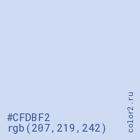 Цвет #CFDBF2 в цветовой модели RGB обозначается тремя октетами (207, 219, 242) в десятичном формате и #CFDBF2 в шестнадцатиричном (hex) формате, которые являются интенсивностью красного 207 (hex CF), интенсивность зелёного 219 (hex DB) и интенсивность синего 242 (hex F2).