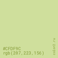 Цвет #CFDF9C в цветовой модели RGB обозначается тремя октетами (207, 223, 156) в десятичном формате и #CFDF9C в шестнадцатиричном (hex) формате, которые являются интенсивностью красного 207 (hex CF), интенсивность зелёного 223 (hex DF) и интенсивность синего 156 (hex 9C).