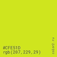 Цвет #CFE51D в цветовой модели RGB обозначается тремя октетами (207, 229, 29) в десятичном формате и #CFE51D в шестнадцатиричном (hex) формате, которые являются интенсивностью красного 207 (hex CF), интенсивность зелёного 229 (hex E5) и интенсивность синего 29 (hex 1D).