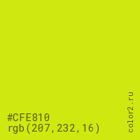 Цвет #CFE810 в цветовой модели RGB обозначается тремя октетами (207, 232, 16) в десятичном формате и #CFE810 в шестнадцатиричном (hex) формате, которые являются интенсивностью красного 207 (hex CF), интенсивность зелёного 232 (hex E8) и интенсивность синего 16 (hex 10).
