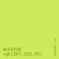 Цвет #CFE95D в цветовой модели RGB обозначается тремя октетами (207, 233, 93) в десятичном формате и #CFE95D в шестнадцатиричном (hex) формате, которые являются интенсивностью красного 207 (hex CF), интенсивность зелёного 233 (hex E9) и интенсивность синего 93 (hex 5D).