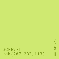 Цвет #CFE971 в цветовой модели RGB обозначается тремя октетами (207, 233, 113) в десятичном формате и #CFE971 в шестнадцатиричном (hex) формате, которые являются интенсивностью красного 207 (hex CF), интенсивность зелёного 233 (hex E9) и интенсивность синего 113 (hex 71).