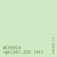 Цвет #CFE9C4 в цветовой модели RGB обозначается тремя октетами (207, 233, 196) в десятичном формате и #CFE9C4 в шестнадцатиричном (hex) формате, которые являются интенсивностью красного 207 (hex CF), интенсивность зелёного 233 (hex E9) и интенсивность синего 196 (hex C4).