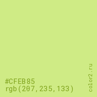 Цвет #CFEB85 в цветовой модели RGB обозначается тремя октетами (207, 235, 133) в десятичном формате и #CFEB85 в шестнадцатиричном (hex) формате, которые являются интенсивностью красного 207 (hex CF), интенсивность зелёного 235 (hex EB) и интенсивность синего 133 (hex 85).