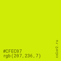 Цвет #CFEC07 в цветовой модели RGB обозначается тремя октетами (207, 236, 7) в десятичном формате и #CFEC07 в шестнадцатиричном (hex) формате, которые являются интенсивностью красного 207 (hex CF), интенсивность зелёного 236 (hex EC) и интенсивность синего 7 (hex 07).