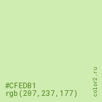 Цвет #CFEDB1 в цветовой модели RGB обозначается тремя октетами (207, 237, 177) в десятичном формате и #CFEDB1 в шестнадцатиричном (hex) формате, которые являются интенсивностью красного 207 (hex CF), интенсивность зелёного 237 (hex ED) и интенсивность синего 177 (hex B1).