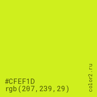 Цвет #CFEF1D в цветовой модели RGB обозначается тремя октетами (207, 239, 29) в десятичном формате и #CFEF1D в шестнадцатиричном (hex) формате, которые являются интенсивностью красного 207 (hex CF), интенсивность зелёного 239 (hex EF) и интенсивность синего 29 (hex 1D).