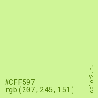Цвет #CFF597 в цветовой модели RGB обозначается тремя октетами (207, 245, 151) в десятичном формате и #CFF597 в шестнадцатиричном (hex) формате, которые являются интенсивностью красного 207 (hex CF), интенсивность зелёного 245 (hex F5) и интенсивность синего 151 (hex 97).