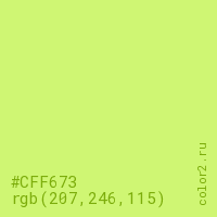 Цвет #CFF673 в цветовой модели RGB обозначается тремя октетами (207, 246, 115) в десятичном формате и #CFF673 в шестнадцатиричном (hex) формате, которые являются интенсивностью красного 207 (hex CF), интенсивность зелёного 246 (hex F6) и интенсивность синего 115 (hex 73).