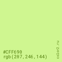 Цвет #CFF690 в цветовой модели RGB обозначается тремя октетами (207, 246, 144) в десятичном формате и #CFF690 в шестнадцатиричном (hex) формате, которые являются интенсивностью красного 207 (hex CF), интенсивность зелёного 246 (hex F6) и интенсивность синего 144 (hex 90).