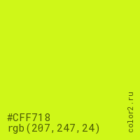 Цвет #CFF718 в цветовой модели RGB обозначается тремя октетами (207, 247, 24) в десятичном формате и #CFF718 в шестнадцатиричном (hex) формате, которые являются интенсивностью красного 207 (hex CF), интенсивность зелёного 247 (hex F7) и интенсивность синего 24 (hex 18).