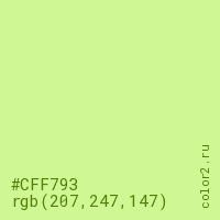 Цвет #CFF793 в цветовой модели RGB обозначается тремя октетами (207, 247, 147) в десятичном формате и #CFF793 в шестнадцатиричном (hex) формате, которые являются интенсивностью красного 207 (hex CF), интенсивность зелёного 247 (hex F7) и интенсивность синего 147 (hex 93).