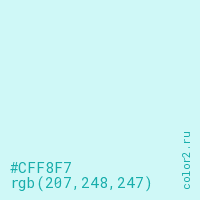 Цвет #CFF8F7 в цветовой модели RGB обозначается тремя октетами (207, 248, 247) в десятичном формате и #CFF8F7 в шестнадцатиричном (hex) формате, которые являются интенсивностью красного 207 (hex CF), интенсивность зелёного 248 (hex F8) и интенсивность синего 247 (hex F7).