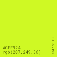 Цвет #CFF924 в цветовой модели RGB обозначается тремя октетами (207, 249, 36) в десятичном формате и #CFF924 в шестнадцатиричном (hex) формате, которые являются интенсивностью красного 207 (hex CF), интенсивность зелёного 249 (hex F9) и интенсивность синего 36 (hex 24).
