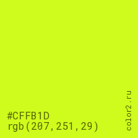 Цвет #CFFB1D в цветовой модели RGB обозначается тремя октетами (207, 251, 29) в десятичном формате и #CFFB1D в шестнадцатиричном (hex) формате, которые являются интенсивностью красного 207 (hex CF), интенсивность зелёного 251 (hex FB) и интенсивность синего 29 (hex 1D).