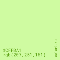 Цвет #CFFBA1 в цветовой модели RGB обозначается тремя октетами (207, 251, 161) в десятичном формате и #CFFBA1 в шестнадцатиричном (hex) формате, которые являются интенсивностью красного 207 (hex CF), интенсивность зелёного 251 (hex FB) и интенсивность синего 161 (hex A1).