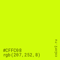 Цвет #CFFC08 в цветовой модели RGB обозначается тремя октетами (207, 252, 8) в десятичном формате и #CFFC08 в шестнадцатиричном (hex) формате, которые являются интенсивностью красного 207 (hex CF), интенсивность зелёного 252 (hex FC) и интенсивность синего 8 (hex 08).