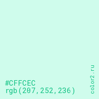 Цвет #CFFCEC в цветовой модели RGB обозначается тремя октетами (207, 252, 236) в десятичном формате и #CFFCEC в шестнадцатиричном (hex) формате, которые являются интенсивностью красного 207 (hex CF), интенсивность зелёного 252 (hex FC) и интенсивность синего 236 (hex EC).