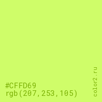 Цвет #CFFD69 в цветовой модели RGB обозначается тремя октетами (207, 253, 105) в десятичном формате и #CFFD69 в шестнадцатиричном (hex) формате, которые являются интенсивностью красного 207 (hex CF), интенсивность зелёного 253 (hex FD) и интенсивность синего 105 (hex 69).