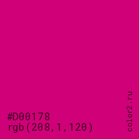 Цвет #D00178 в цветовой модели RGB обозначается тремя октетами (208, 1, 120) в десятичном формате и #D00178 в шестнадцатиричном (hex) формате, которые являются интенсивностью красного 208 (hex D0), интенсивность зелёного 1 (hex 01) и интенсивность синего 120 (hex 78).