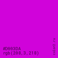 Цвет #D003DA в цветовой модели RGB обозначается тремя октетами (208, 3, 218) в десятичном формате и #D003DA в шестнадцатиричном (hex) формате, которые являются интенсивностью красного 208 (hex D0), интенсивность зелёного 3 (hex 03) и интенсивность синего 218 (hex DA).