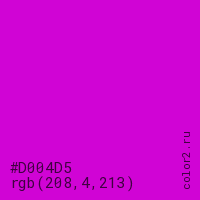 Цвет #D004D5 в цветовой модели RGB обозначается тремя октетами (208, 4, 213) в десятичном формате и #D004D5 в шестнадцатиричном (hex) формате, которые являются интенсивностью красного 208 (hex D0), интенсивность зелёного 4 (hex 04) и интенсивность синего 213 (hex D5).