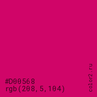 Цвет #D00568 в цветовой модели RGB обозначается тремя октетами (208, 5, 104) в десятичном формате и #D00568 в шестнадцатиричном (hex) формате, которые являются интенсивностью красного 208 (hex D0), интенсивность зелёного 5 (hex 05) и интенсивность синего 104 (hex 68).